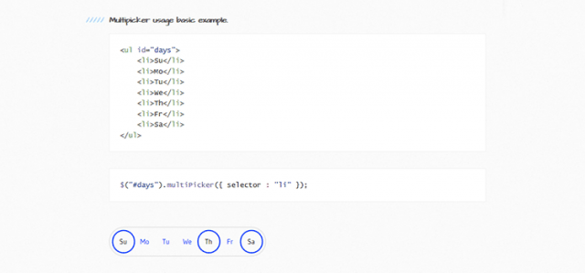 リスト内の単一アイテム(ラジオボタンのようなもの)か複数のアイテム(チェックボックスのようなもの)を選択するユーザーに対して、Multipickerは見た目にきれいな手法を提供します。前述のフォーム要素か、順序のないリストのようなHTML要素を使用することが可能です。