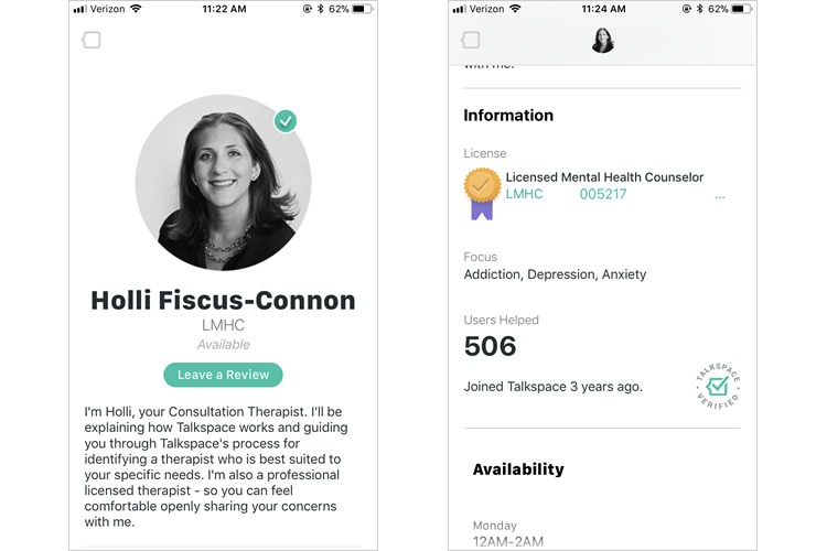 Talkspaceはプラットフォームを人間化し、ユーザが遠隔医療に対して抱く可能性のある不安や疑念を払拭するというデザイン選択の戦略を引き続き行っています。画面には、Holli氏の所有する資格や彼女の得意分野、助けたユーザーの数、空き情報、そして素敵な「Talkspace認定」アイコンが含まれています。これは、ユーザー体験において永久的な役割を果たす、上手にデザインされた主要な画面です。