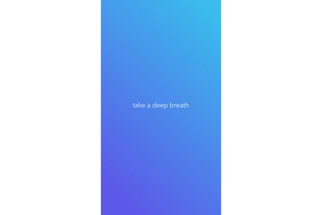 アイコンをタップすると、Calmのスプラッシュ画面が表れます。「スプラッシュ」は大げさすぎるかもしれませんが。アイコンに使われているのと同じ、柔らかなブルーのグラデーションの画面で、水滴が1粒ぽつんと落ちるように「深呼吸しましょう」というフレーズが表示されます。長々しい退屈なオンボーディングのプロセスでないことを期待しつつ進めていきます。