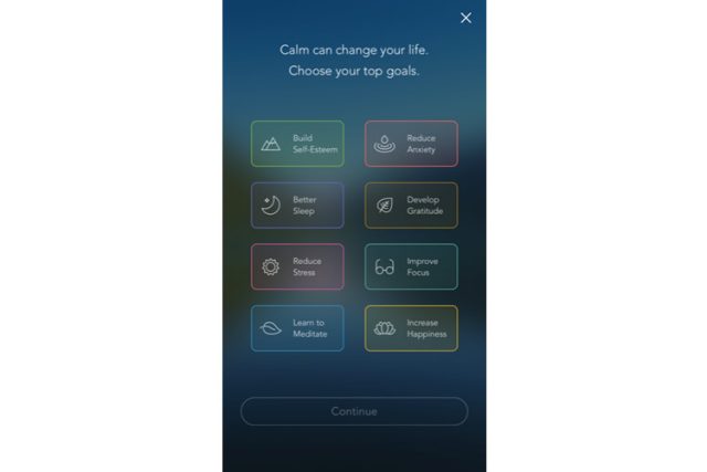 標準的な「登録する/ログインする」の画面が表示されると思っていましたが、自分の目標を選択する画面が表示されました。ここでCalmは、このプログラムを使う利点を表示しています。「自尊心の確立」から「幸せを増やす」まで、あらゆるものが提供されています。