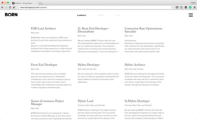 その一方で、Bornの求人ページを見てみましょう。たしかに、よりたくさんの文章がありますが、気を紛らわす装飾が1つもないので機能しています。これらの求人票が、1ピクセルのボーダーの中に入れられているのを想像してみてください。情報の流し読みはより難しくなるでしょう。