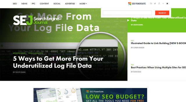 この上手な実践例であるSearch Engine Journalは、すぐに表示できるドロップダウンの検索フィールドを右上の隅に配置しています。また検索フィールドには、誰でも普遍的に理解できる小さな虫メガネのアイコンを使っています。