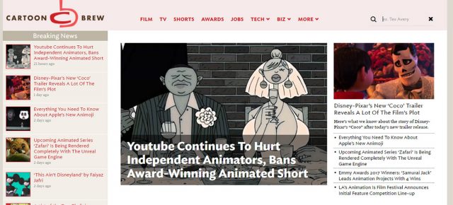 インラインの検索フィールドの例として、Cartoon Brewのデザインを見てみましょう。ナビゲーションには虫メガネのアイコンがはっきりと存在しますが、トグルボタンを押すまでフォームは現れません。