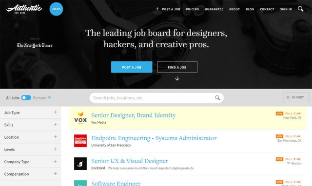 この手法を使えば、検索フィールドはいつでも表示され、必要に応じて小さく縮小するようになります。Authentic Jobsはこのトレンドを実行している好例の1つです。