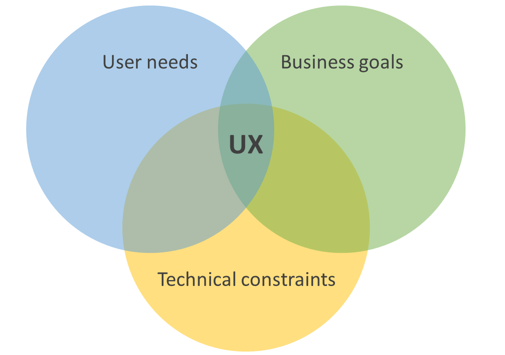 素晴らしいUXとは、そのようなとらえどころのないスイートスポットを見つけることです。その場所は、ユーザーのニーズ、技術の制約、ビジネス目標の間に存在します。ステークホルダーは真っ先にビジネス目標を考えるでしょう。技術チームはまず技術の制約について考えるはずです。したがって、ユーザーに注意を向けられるかどうかは、UXとUXデザイナーがユーザーのニーズを最優先に考えられるかどうかに掛かっています。