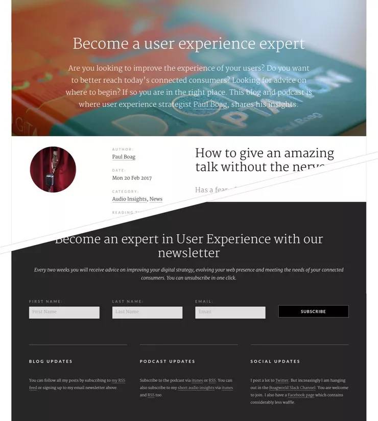 人々にメルマガを購読してもらいたいのなら、メリットを明示するべきです。私のサイトでは、「メルマガに登録して、ユーザー体験のエキスパートになりましょう」という見出しを用いています。このコピーによって、メルマガが読者に何を提供するのかが明確になります。