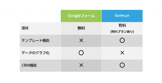 今回の場合、私たちは従来のGoogleフォームの問い合わせフォームからformrunの移行を検討しました。私たちが取り上げてきた機能を整理すると以下のようになります。