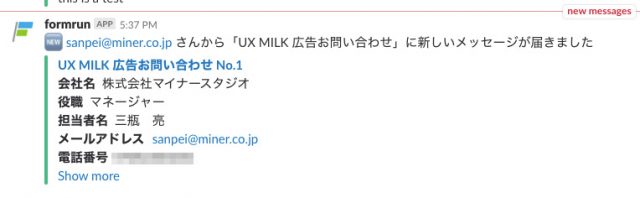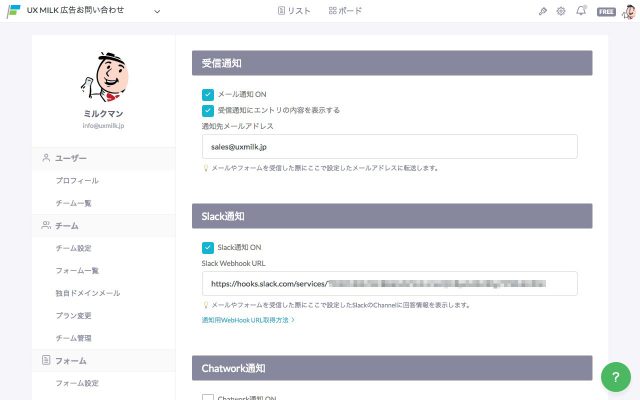 これで問い合わせがあっても、従来通りSlackにも通知が行くようになりました(他にもChatwork連携にも対応していますし、もちろんメールの通知もあります)。
