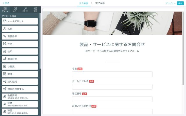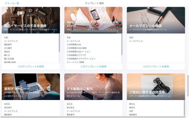 フォームのテンプレートは、ユースケース別に20種類も用意されています。今回は「製品・サービスに関する問い合わせ」を選びました。