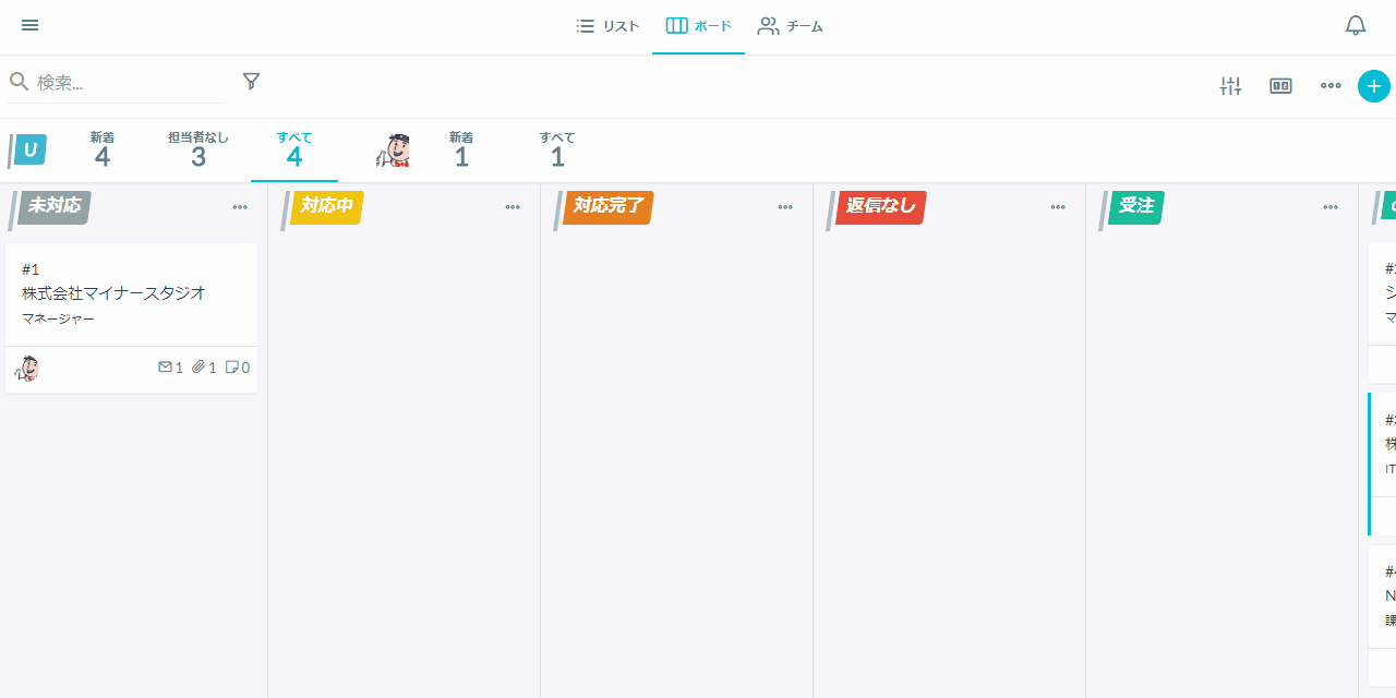 「ボード画面」はTrelloなどでおなじみの「カンバン方式」で、問い合わせが一枚ずつカードとなって表示され、案件のステータスによってそれぞれのエリアにカードを移動できるようになっています。デフォルトでは「未対応」「対応中」「対応完了」と用意してありました。