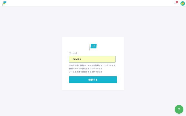 チームを作ると、この中に複数のフォームを作れるようです。今回はもちろん「UX MILK」というチーム名にしました。このチームの中に「広告の問い合わせ」や「イベントの登壇者の受付」などのフォームを作っていくイメージです。
