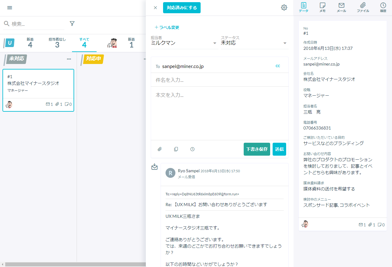 一番右側には問い合わせ文が表示されており、もらった文面を見ながらformrun上で返信することができます。返信した後はカードを「対応中」に移動させて完了です。