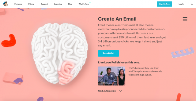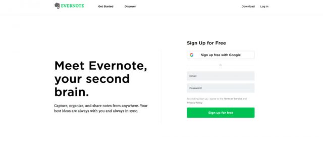 シンプルで使いやすいインターフェイスとして定番のスタイルです。ミニマリズムは、十分なネガテイブスペース(余白)、大きく太字のタイポグラフィ、カラフルなアクセントといった特徴から特定できます。上記のEvernoteのように、トップページでは、重要なCTAに注目させるために色がもっとも効果を持ちます。