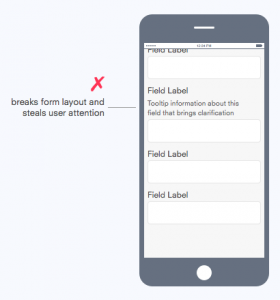 ツールチップではなくフィールドラベルの下に情報を表示する方法をすすめるデザイナーもいるかもしれません。しかし、この方法には、フォームのレイアウトが崩れるだけでなく、情報を必要としないユーザーの関心まで奪ってしまうという問題があります。