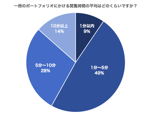 田中:同じく求人企業にアンケートで「ポートフォリオをどれくらい時間かけて読みますか?」と質問をしたのですが、過半数以上が「1つのポートフォリオにかけるのは5分以内」という結果でした。