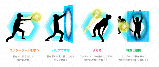 イメージとしては3対3で行う、無限に弾が撃てるドッジボールを想像して頂ければと思います。まず準備として、頭にヘッドマウントディスプレイ、腕にはモーションセンサーを装着します。試合では、腕を前に突き出すことで相手にエナジーボールを撃つことができます。エナジーボールが相手の身体の前に表示されているライフをすべて破壊すると1点が加算されます。エナジーボールは身体を使って避けるか、シールドを張ることで防御することができます。