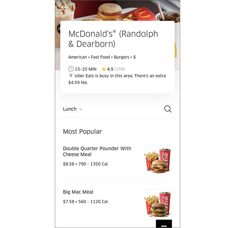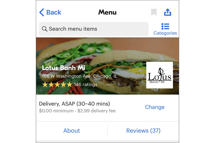 ほとんどのアプリがこのユーザー体験を上手に取り入れていますが、個人的にはもっとメニューの説明や写真が欲しいです。たとえばDoorDashやGrubHubは、メニュー項目の写真を表示してくれませんが、UberEatsでは写真を見ることができました。