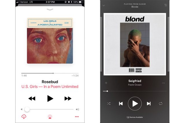 2つの音楽プレーヤーを並べてみると、すぐに両者のはっきりとした違いがわかります。 どちらのインターフェイスもカバーアートの強調を目指していますが、選んだ戦略が異なります。Apple MusicはAppleブランドの慣習に沿って、全体に白色を選択しています。一方で、Spotifyは暗い色です。(この色の選択については、私の記事『light vs dark UIs』でも述べています。)