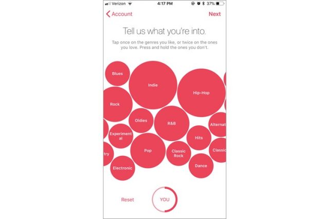 これは、Appleのアルゴリズムにおけるインプットメカニズムの一例です。ユーザーの好みのジャンルに基づいて、どれがおすすめかを比較しています。問題は、この変わったインターフェイスがユーザビリティに深刻な悪影響を与えていることです。円がインターフェイスのあちこちで弾んでいる中で、指を色々な方向にスワイプしてクリックするのはイライラします。