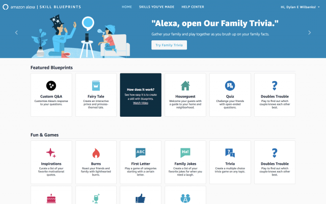 Skill BlueprintsのWebサイトを立ち上げると、ユーザーが彼ら自身のサービスを作るための20個ほどの「設計図」が表示されます。これらの中には、書き換えて使うことのできるインタラクションはほとんどありません。質疑応答や穴埋めのような簡単な書き換えのみになります。