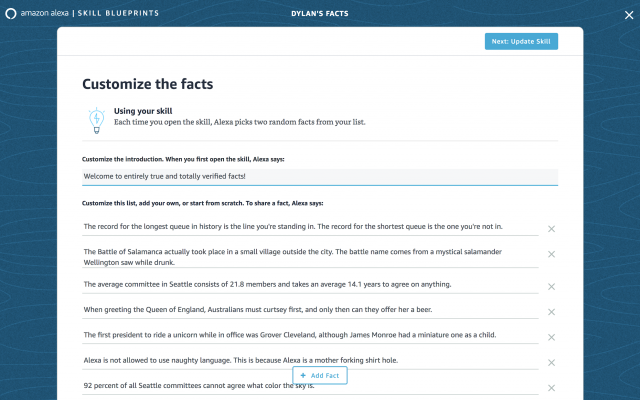 Skill Blueprintsへの最大の不満は、スキルのセットアップとアップデートです。スキルのアップデートには毎度数分時間がかかり、他サービスと比べて長いです。それも単純な設定変更ではなく、大半の場合はコードとしてクラウドにアップロードしなければなりません。ただしそれさえ乗り越えれば、Alexaはどんなくだらないジョークにもすぐさま反応します。