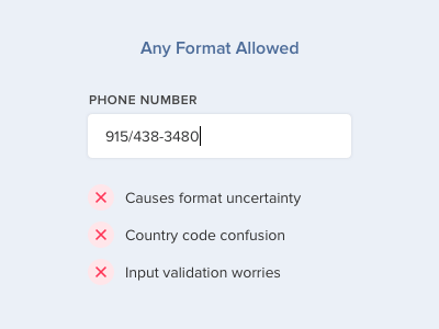 アメリカ国外のユーザーは、これとは異なる電話番号のフォーマットであるため上手く入力できない可能性があります。1つの国だけに合った入力フォームは、国際的なユーザーに優しくありません。