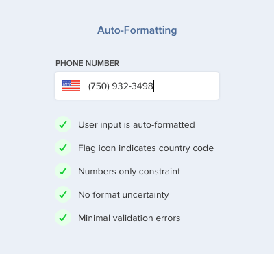 ジオロケーションを活用しユーザーのいる国を判別することで、どんな国からのユーザーにも対応して自動で電話番号をフォーマット化できます。またこれによって、国番号を入力する手間も省けます。ユーザーは少ない労力で入力することができ、フォームの価値も上がるでしょう。