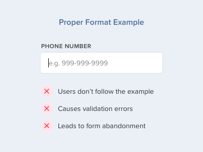 しかし、ユーザーは入力例に気づいても結局その通りに入力しないことがわかっています。ある研究では、「89%の被験者は例とは異なる電話番号フォーマットで入力した」ことが示されました。