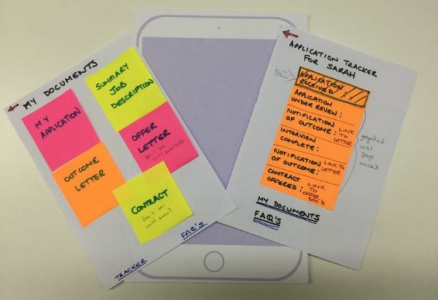 ことわざにあるように、百聞は一見に如かずです。写真や動画を使えば、ケーススタディを鮮明に表すことができます。ワークショップの写真やスケッチ、シナリオマップ、親和性マップ、さらにはインタビューや観察といったリサーチの写真も載せるといいでしょう。あるいは、初期のプロトタイプのスクリーンショット、デザインの進捗を示すモックアップを載せてもいいです。作業するときには、将来の成功のためにいつも記録しておきましょう。