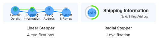 放射型であれば内容を認識するために必要な注視時間が短くなるため、ユーザーは自分の進捗状況をより素早く知ることができます。放射型が示す内容を認識するには、今作業している1段階だけを見れば済みます。一方で、直線型は他のステップも含めた4段階すべてを見なければなりません。視認時間が短いほど入力が早く進み、フォームの入力完了にも繋がりやすくなります。可視性と可読性が鍵