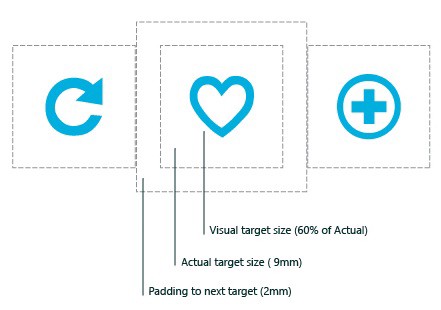 アイコンはユーザーにとって押しやすくあるべきです。 携帯電話のスペースのためにアイコンをあまりにも小さくすることは、デザイナーの間でも起きやすい間違いの1つです。 タッチ用にデザインするときは、アイコンが指で触れやすい大きさであることを確認してください。 タッチスクリーンオブジェクトの推奨サイズは710 mmです。 また間違ったタップを防ぐために、ターゲット間に必ずパディングを追加してください。