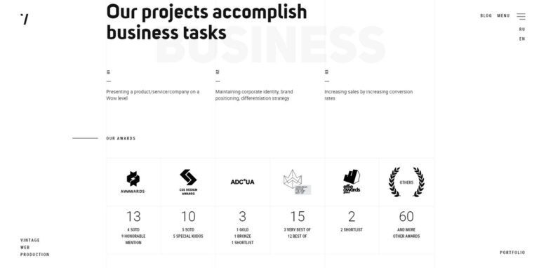 魅力的な過去実績の他に、エージェンシーとして数値をアピールする機会を逃しません。このサイトでは、統計的数値を全体的なデザインに完璧にマッチするよう絶妙に取り入れることでユーザー体験を高めています。