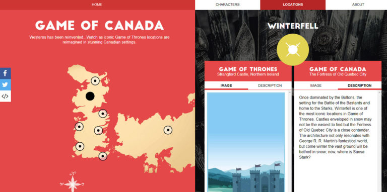 Game of Canadaの作成チームは、上記の例とほぼ同じアプローチを用いています。地図はユーザー体験のなくてはならない一部分ですが、今回の場合はマップをフラットでグラフィカルな形で置いています。それぞれのポインターをクリックし、米ドラマGame of Thronesのカナダ版のようなコンテンツをお楽しみください。