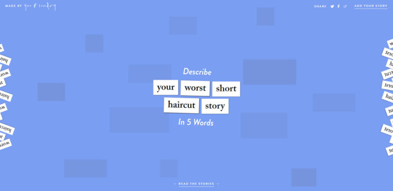 Your Worst Short Haircut Storyを見るのもいいかもしれません。最初はデータビジュアライゼーション に見えないかもしれませんが、ユーザーが体験した悪い体験をスマートにコンテンツに落とし込んでいます。このデザインはアイデアを中心に据えたいときにあるべきデザインとなっています。このプロジェクトを3語で表すなら「面白く」て、「シンプル」で、「独創的」です。