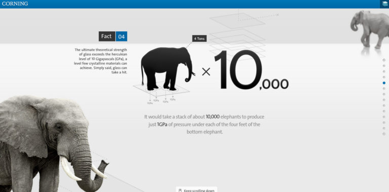 たとえばCorning Glass Classでは、ガラス製品についてグラフィカルなアプローチを用い、多くの情報を提供しています。これは2012年に作られたものなので、Webサイト上にデータビジュアライゼーションが登場し始めた様子が伺い知れます。