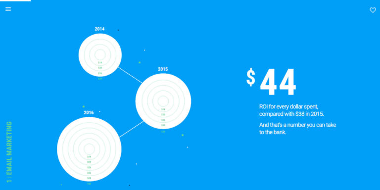 Campaign Monitorは綺麗でシンプルなデザインを用いており、わずかにハイテクな雰囲気を持っています。チャートやバーのような昔ながらのデータビジュアライゼーションを上手く使っているのが特徴で、それでいて目立たないアニメーションを表現しています。