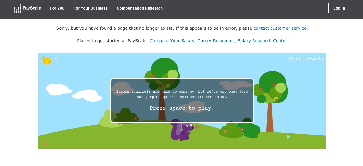 ユーザーに退屈なエラーページを表示する代わりに、Pay Scaleでは失敗の瞬間を楽しい経験に変えています。