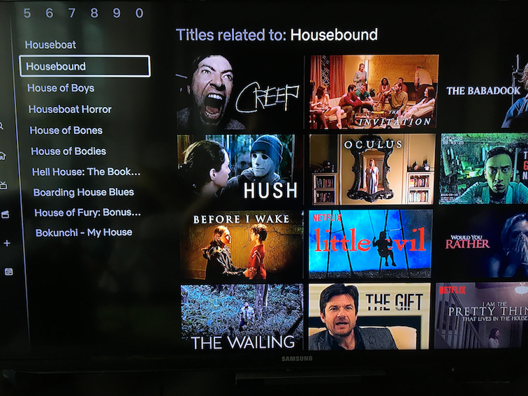 友人に勧められた「Housebound」という映画観たくてたまりません。とてもよいホラー映画らしく評判も高いので、怖がる準備はできています。Netflixで調べてみると見たい映画はありませんでしたが、「結果が見つかりません」というメッセージの代わりに、Netflixから選べる「Housebound」と似た映画のリストが表示されました。