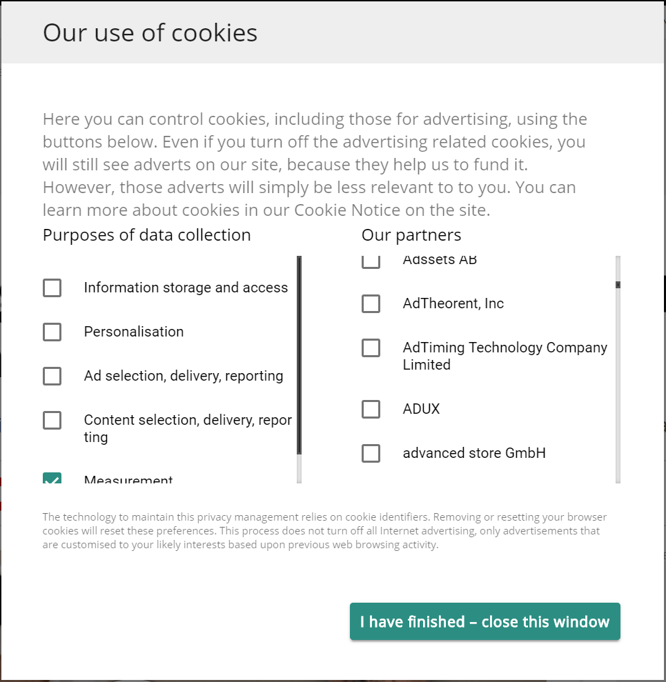 際立っているのはGuardiansのWebサイトです。同サイトでCookieの使用をオプトアウトすると、ユーザーはそのCookieを使用しているであろうインスタンスを一つ一つ選択解除しなくてはなりません。図表1を見てわかる通り、右側にあるスクロールバーの大きさと位置から、とても小さく見づらいウィンドウの中に何百もの選択肢がありそうなことが見て取れます。これをユーザーフレンドリーにするためには、一括して全ての選択を解除するオプションがリストにあったらよかったのですが、実際にはそうではなく、ユーザーは、多くの人が諦めてしまうような手間のかかる作業を強いられます。