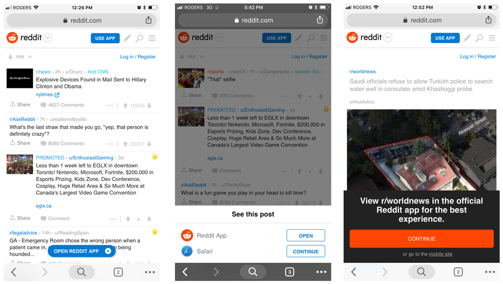 「インターネットのフロントページ」を標榜するRedditは、世界で最も多くの人が訪れたWebサイトの一つです。過去3ヶ月、このサイトにおいてはモバイルアプリにユーザーを誘導しようという強い動きがありました。それぞれの体験を詳細に比較することはしませんが、アプリの方が優れている点(新規ポストの作成)も、モバイルサイトの方が良い点(読みやすさ)もあります。それとは関係なく、私の目を引いたのはダークパターンが使われ過ぎている点です。