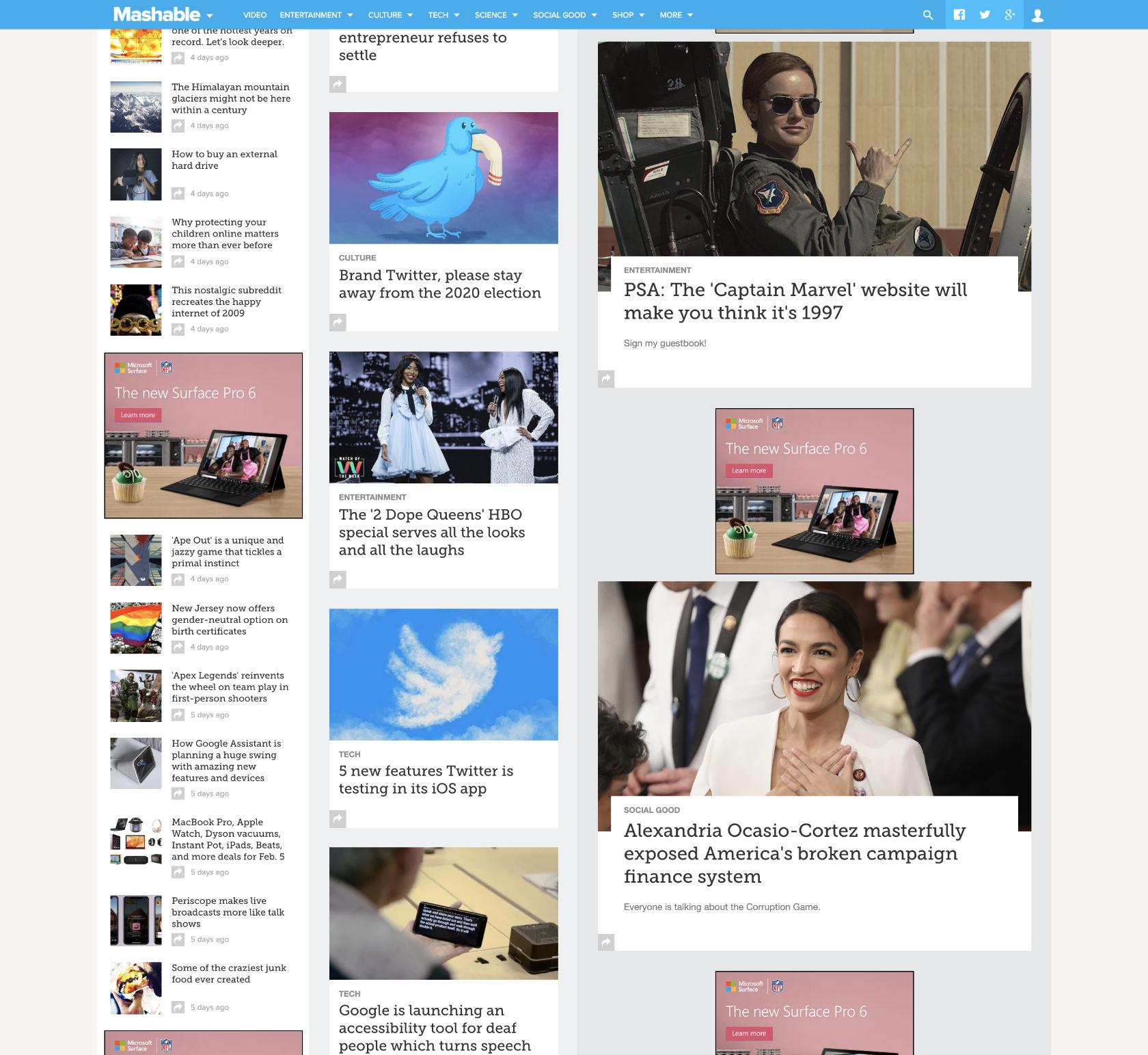 Mashableのトップページは、ユーザーがスクロールするのに合わせて新しいコンテンツを自動的にロードし、それによって、ユーザーをより長くページに留まらせています