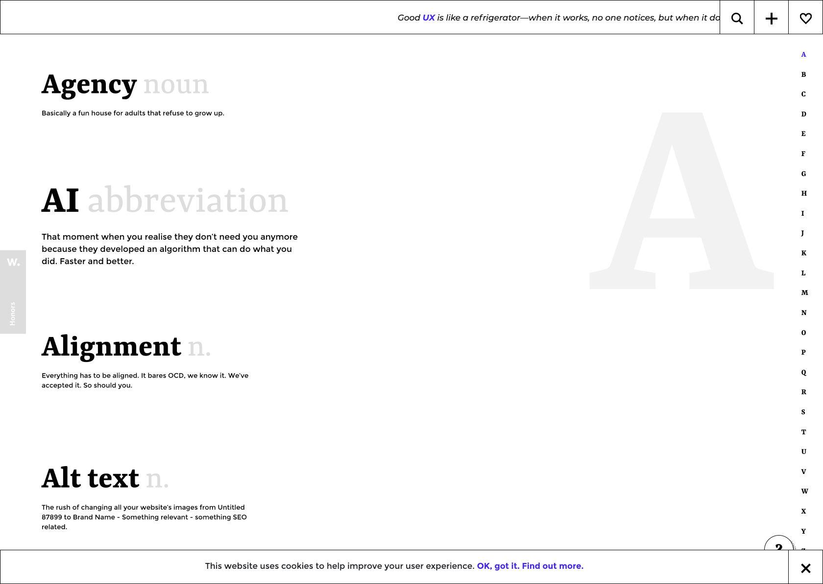The Fake It DigitalのWebサイトは一般的なビジネス用語やデザイン用語、マーケティング用語に別のユーモラスな定義を表示するために、ロングスクロールを使っています