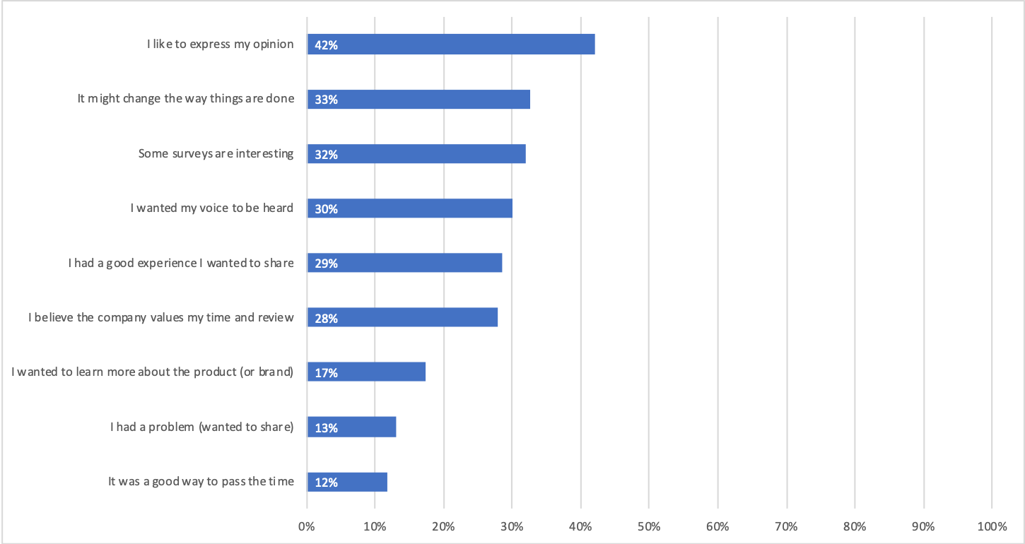 回答が多かった理由は、自分の意見を表明したかったから(42%)、現状のあり方を変えたかったから(33%)、アンケートがおもしろそうだったから(32%)でした。注目すべき点として、問題を抱えていた(ネガティブな体験をしていた)人は13%しかいません。対照的に、ポジティブな体験をした人は倍以上いました(29%)。「その他」を選んだ人は5%のみでした。したがって、少なくとも私たちが用いたサンプルでは、これらの理由で人々が無償でアンケートを引き受ける動機を十分に説明できたようです。