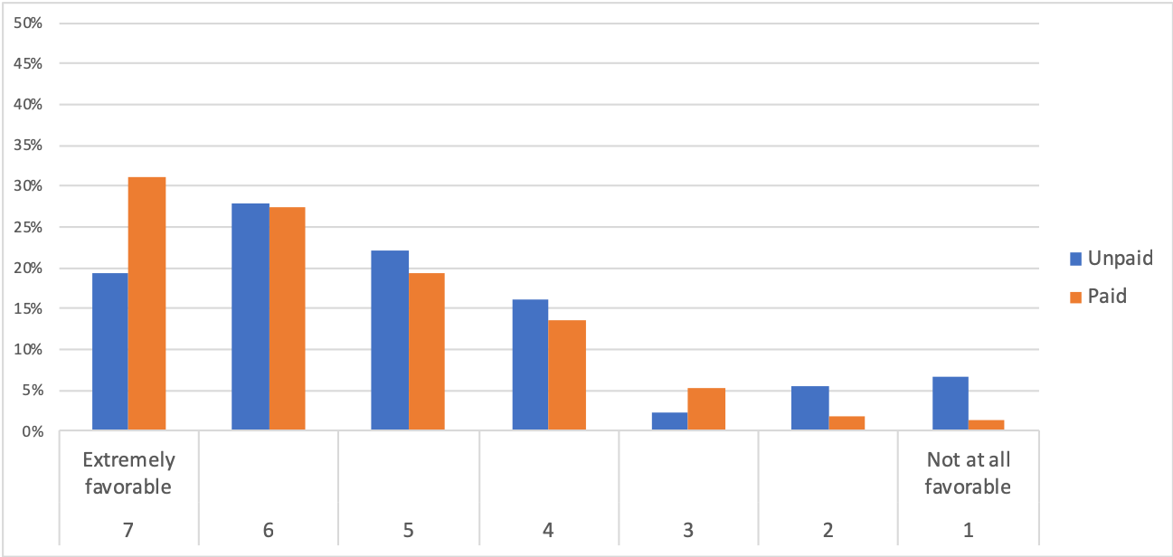 参加者が認識した企業には幅広いバリエーションがありましたが、いくつかの企業は無償のアンケートと有償のアンケートを複数回実施していました。たとえば、10人の同答者がWalmartの無償のアンケートを受けたと回答し、うち1人が同社の有償のアンケートも受けたと回答しました。このような小さな規模のサンプルにおいてさえ、同じパターンが現れました。有償でアンケートに参加した回答者と、無償で参加した回答者の間には、1ポイント(統計学的な有意性の境界)という比較的大きな差がありました(5.4 vs 4.3、p = 0.125)。