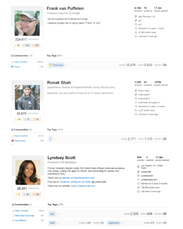 Stackoverflowでは、56万人の登録ユーザー全員が公に評判スコアを持っていて、バッジを集めることもできます。ユーザーの評判は、コミュニティに貢献するたびに上がっていきます。Stackoverflowはベストアンサーを目立たせ、ユーザーに対してお互いに理解しやすい回答を心がけるよう働きかけています。