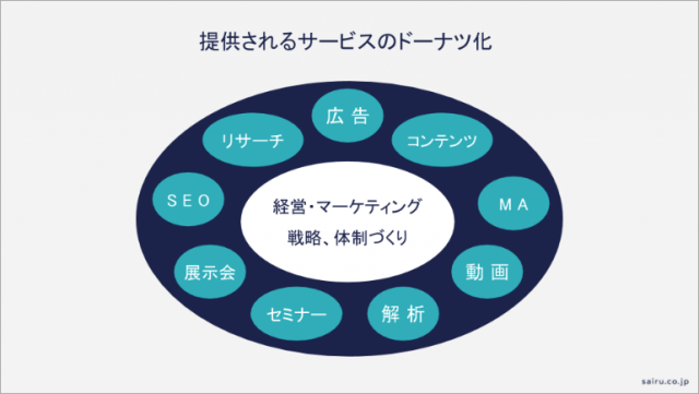ドーナツ化現象とは、下図のようにツールや手法などの周辺サービスは増えているのに、中心にあるべきマーケティングの戦略・体制づくりを支援するサービスが欠けている状態を言います。