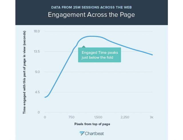 この通念は間違いないでしょう。しかし、ユーザーがほとんどの時間を費やしたり、エンゲージメントしたりしているのがファーストビューとは限りません。2500万回の異なるWebセッションからデータを収集し、ユーザーがスクロールした量と閲覧時間を図示した、以下のChartbeatのグラフをご覧ください。