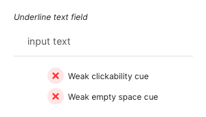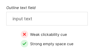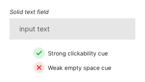 すべてのユーザーにとって明確な手がかりにするために、一次的な手がかりと二次的な手がかりを用意する必要があります。入力フィールドの視覚的な手がかりは、クリックのしやすさと空白から成ります。ただ、別のインターフェイスの要素では、視覚的な手がかりが異なることがあるでしょう。