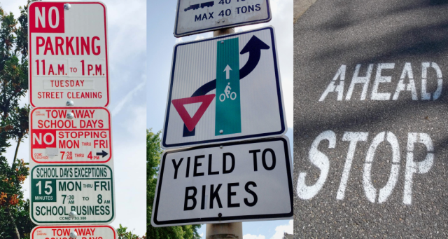 しかし、一時停止標識のような優秀な標識ばかりではなく、読みづらい道路標識も存在しています。運転手の誰もがきっと、複雑すぎる「駐車標識」を読み取るのに時間をかけたことがあるのではないでしょうか。ときどき、下から上に読むように意図された路面標識の各単語の間隔が狭すぎて、「止まれ、前方(Ahead Stop)」や「禁止、携帯(Texting No)」などと読めてしまうことがあります。こういった標識は記号で表すには複雑すぎ、結局テキストで補足が必要となってしまい本来の標識の目的を失ってしまいます。標識を見る運転手は、停車して文字を読み直すような余裕はありません。