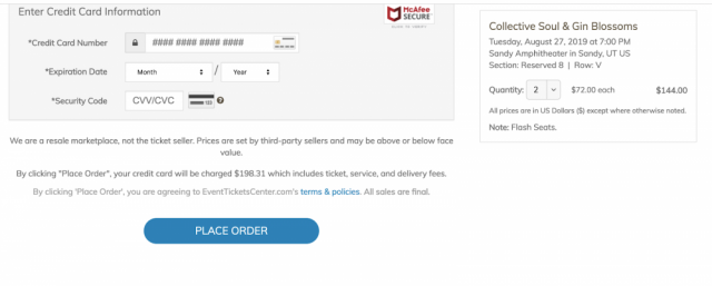 以下に示すのはコンサートチケットの転売サイトの例です。画面上には手数料と税金が含まれていない料金が表記されていますが、よく見ると最終的に支払う金額は内訳も記載せず画面の下部分に小さく表記されています。ユーザーがこれに気づいたら、不明瞭な支払金額について販売店に問い合わせるでしょう。オンライン購入をしようが途中でやめようが、人々は自分が行っていることに自信を持ちたいと思っています。